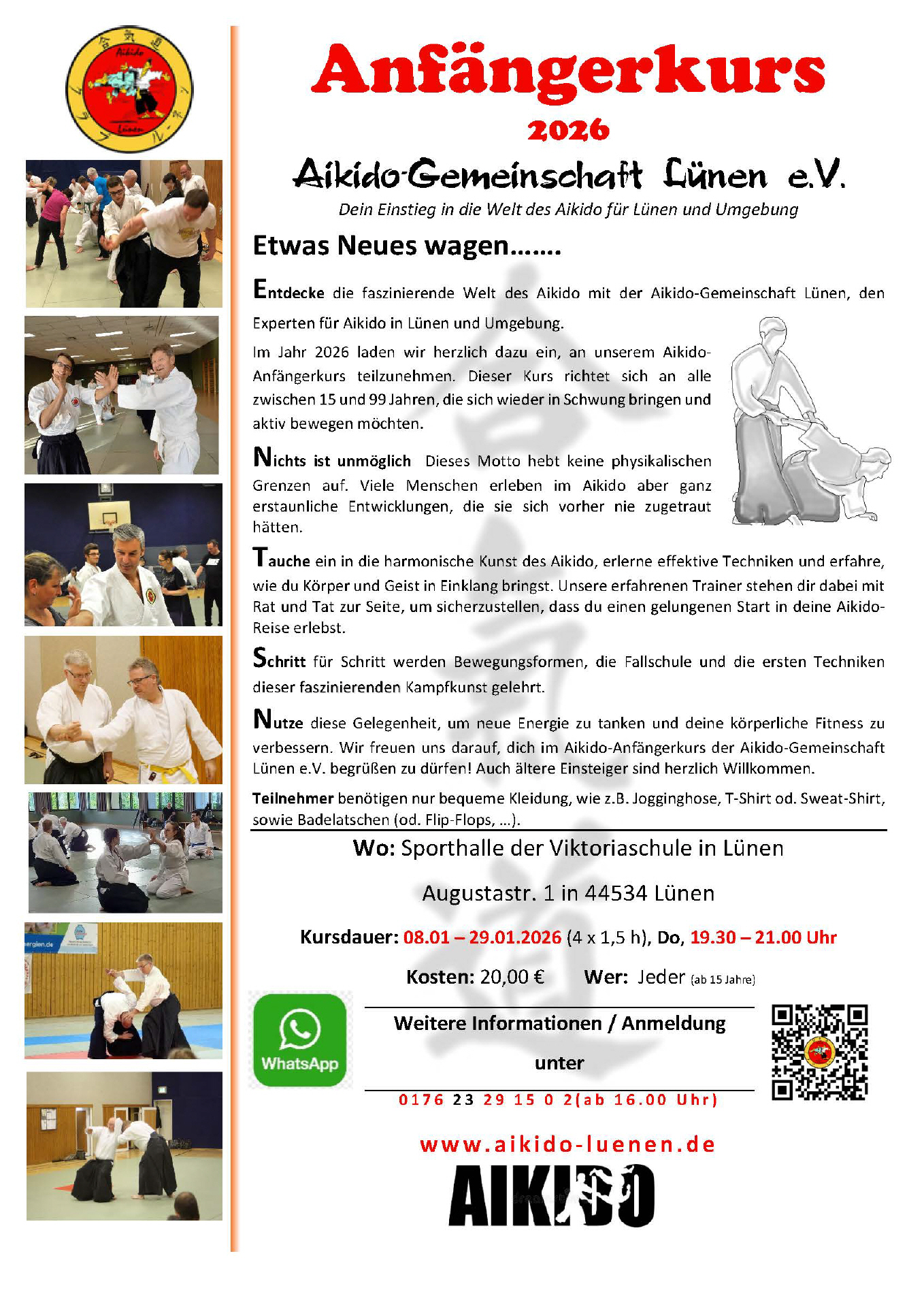 Möchtest du 2026 aktiv ins neue Jahr starten? Die Aikido-Gemeinschaft Lünen e.V. lädt dich herzlich zu einem Aikido-Anfängerkurs ein!